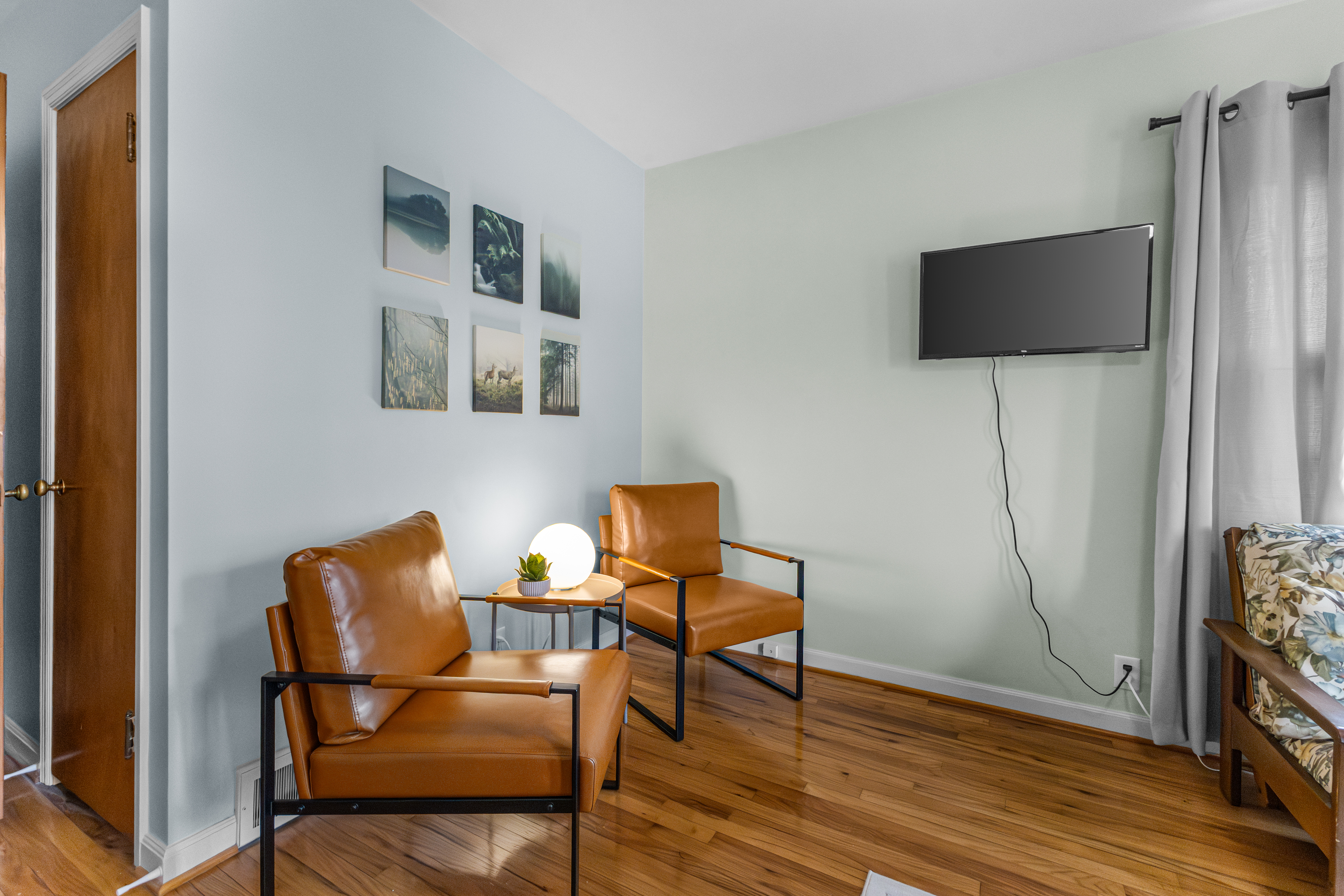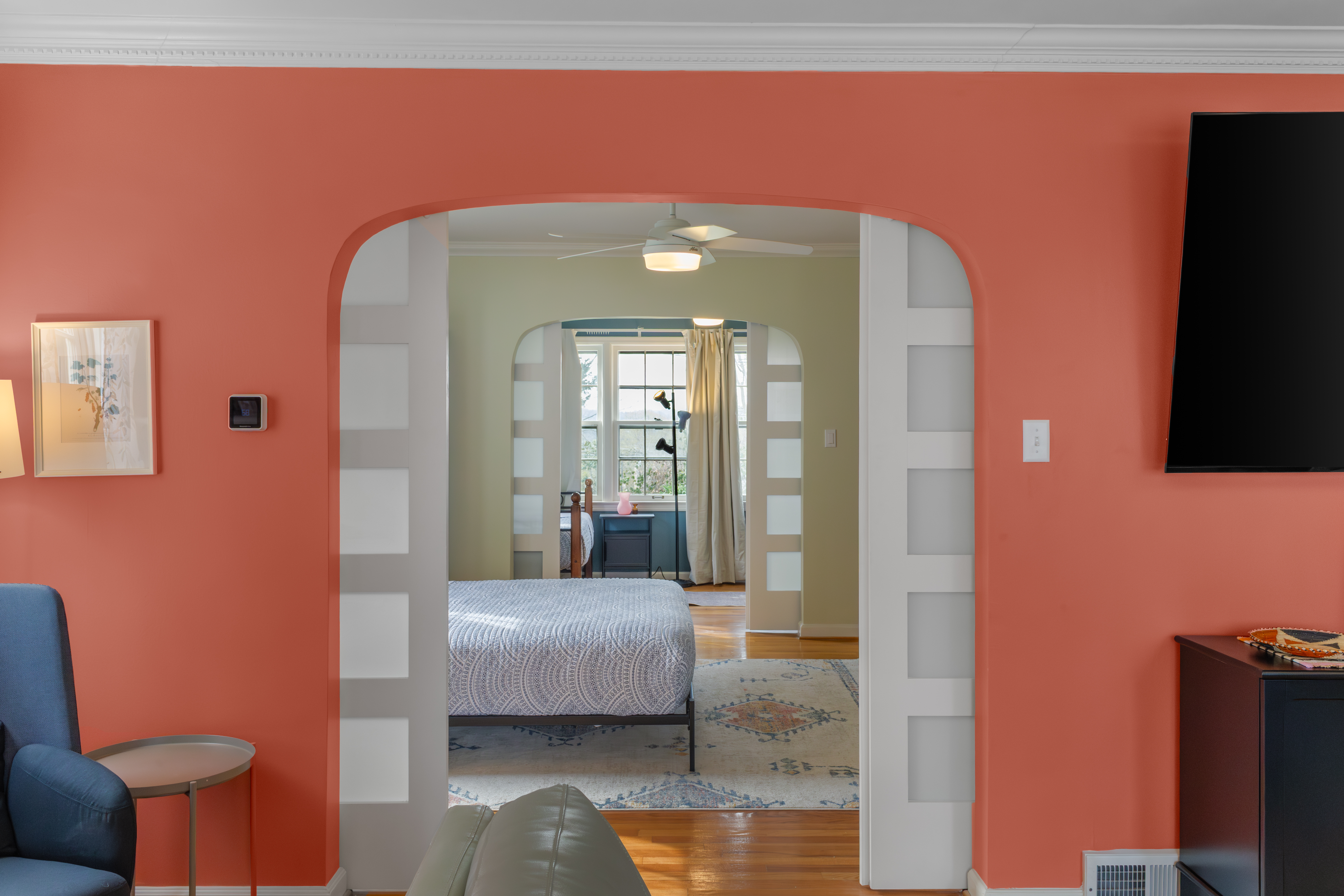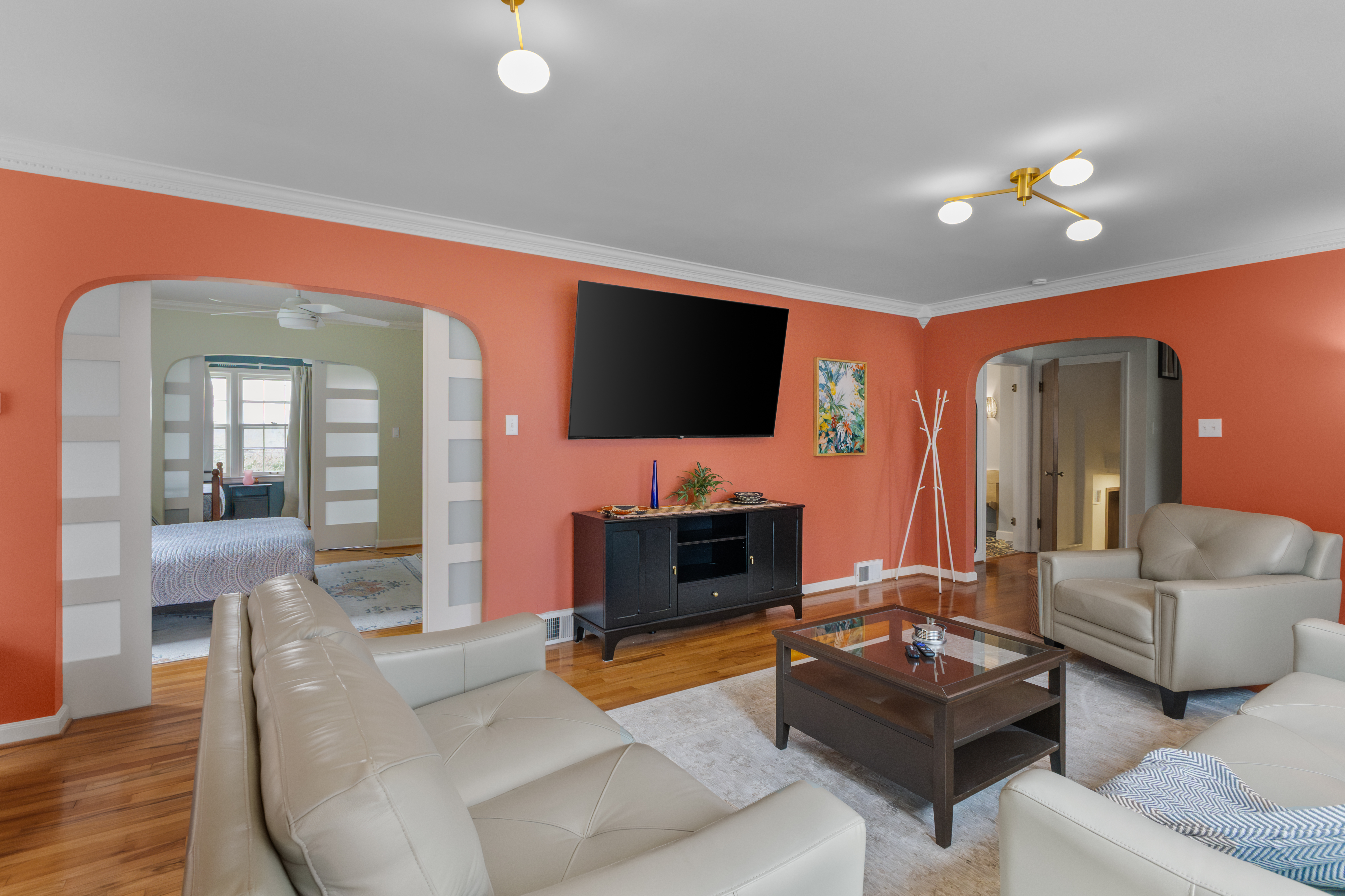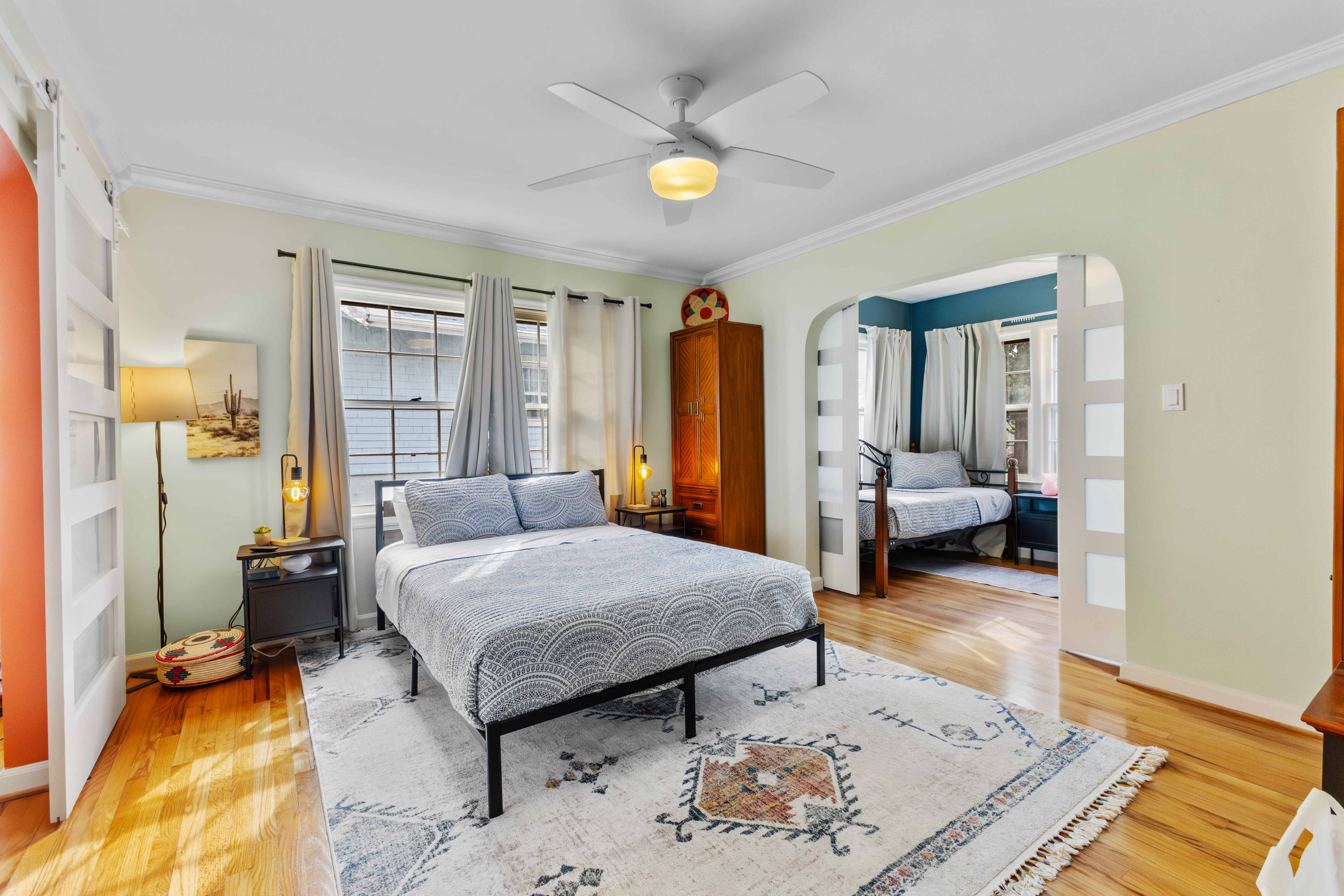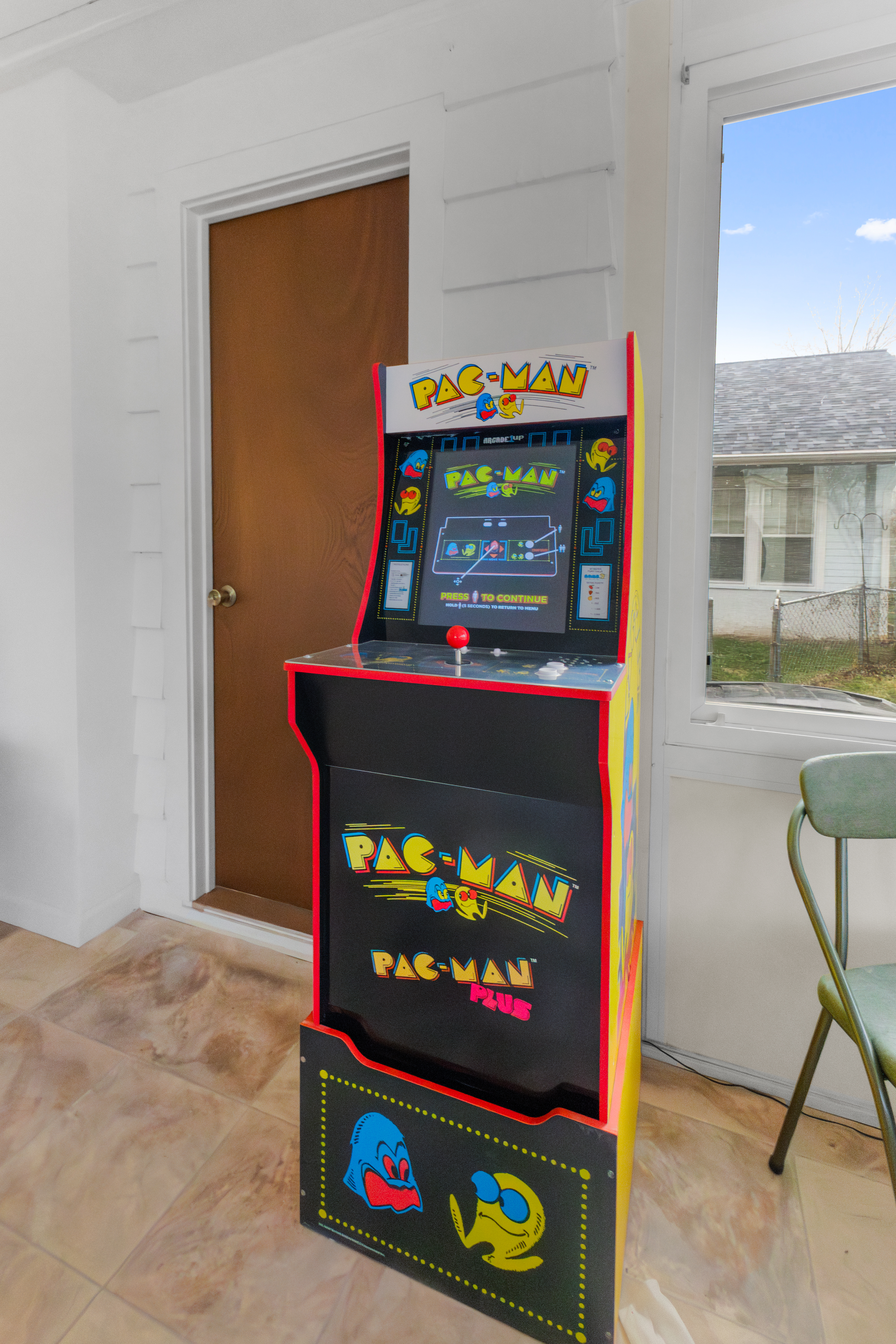 This is a unique, character-filled split-level home in a quiet residential neighborhood. Stairs are required to enter the property, and the layout includes bedrooms on multiple levels. Garage and driveway parking are accessed from a side street approximately 200 feet from the front entrance rather than directly in front of the home. The house is on a fairly busy thoroughfare. The fenced backyard is great for guests traveling with pets (please review house rules before booking). The arcade game is free-play and available for guest enjoyment.